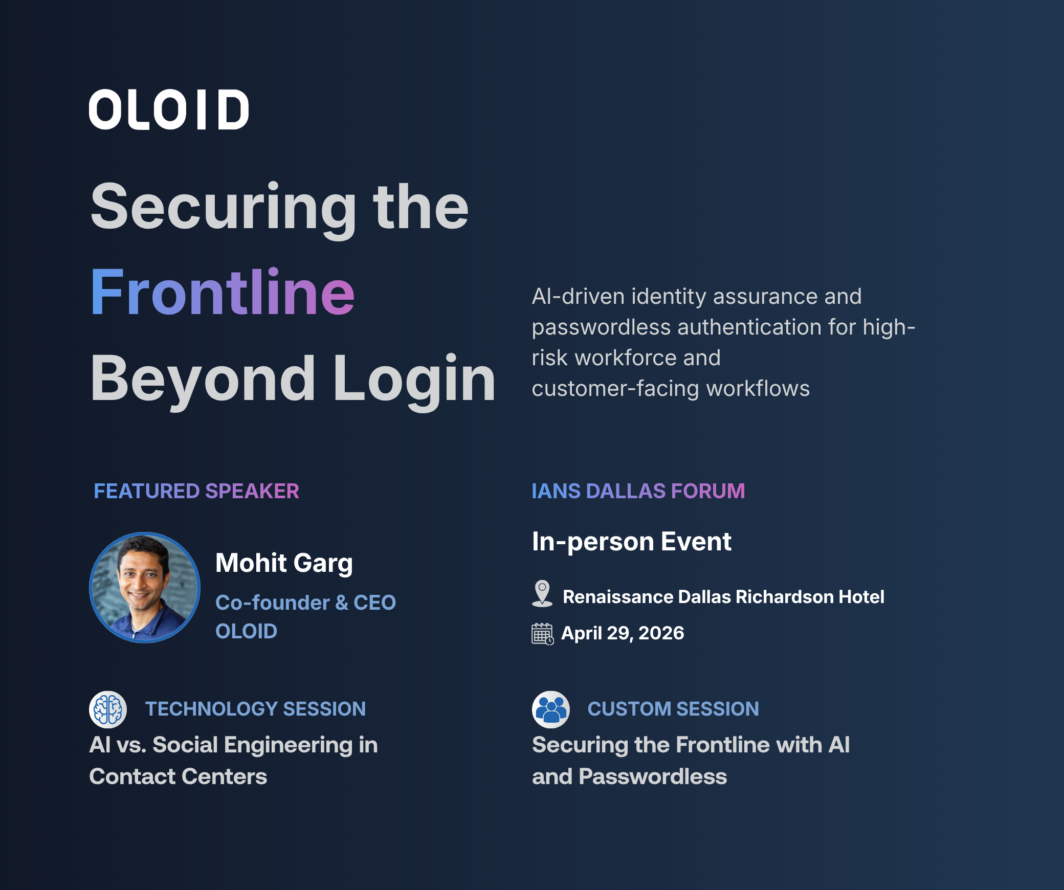 OLOID will be exhibiting at the IANS Forum Dallas on April 29. Visit our team to see how modern identity approaches can secure high-risk interactions across frontline environments. OLOID Co-founders Mohit Garg and Madhu Madhusudhanan will also be speaking on defending against social engineering in contact centers and rethinking identity with AI and passwordless technologies. Book a meeting to connect with us and learn how to build a more resilient, unified identity strategy across your workforce.