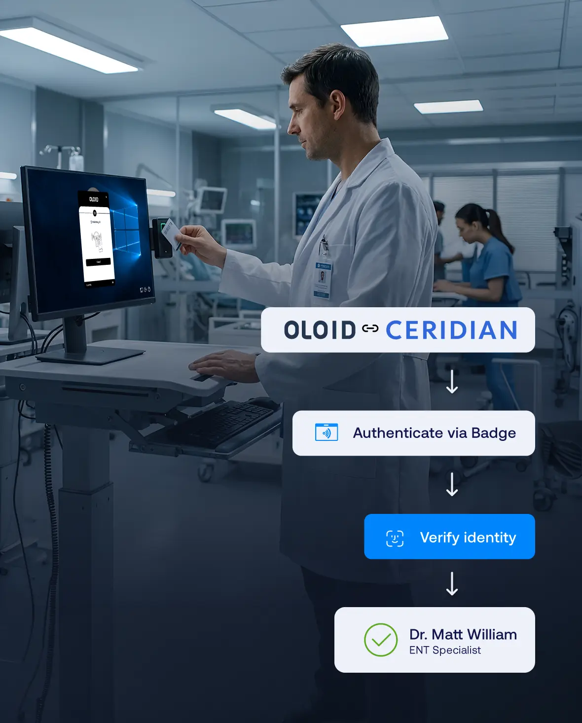 Enable secure, context-aware access across applications and devices using Ceridian as the source of workforce identity, while OLOID delivers phishing-resistant authentication and continuous session control across shared and personal endpoints.