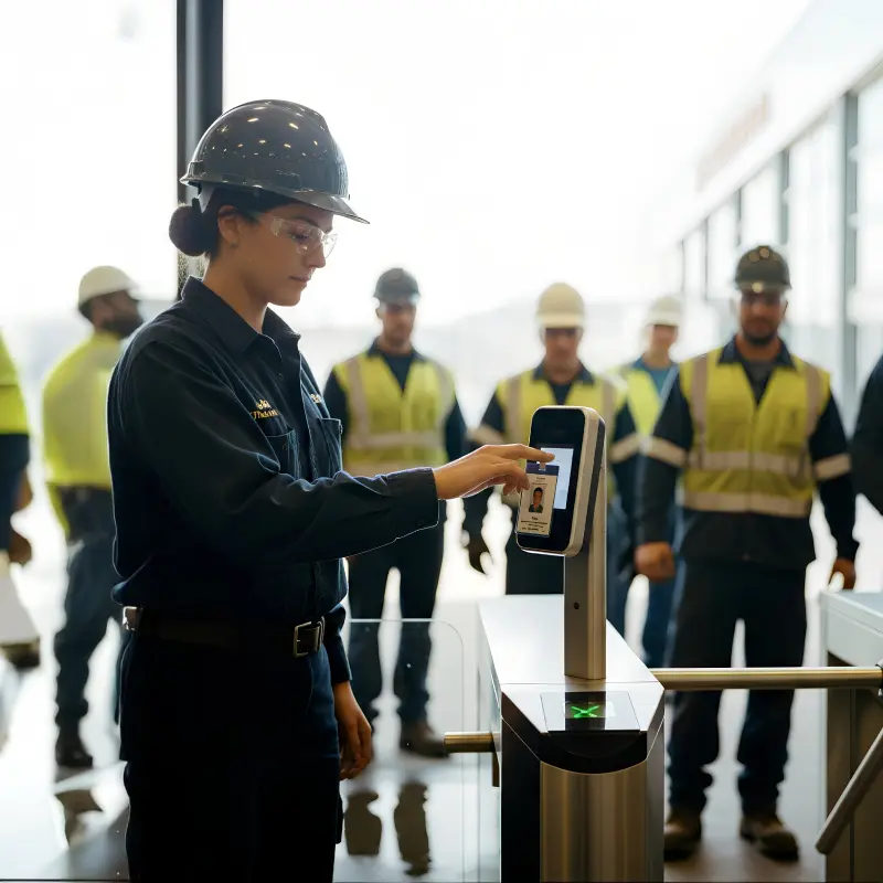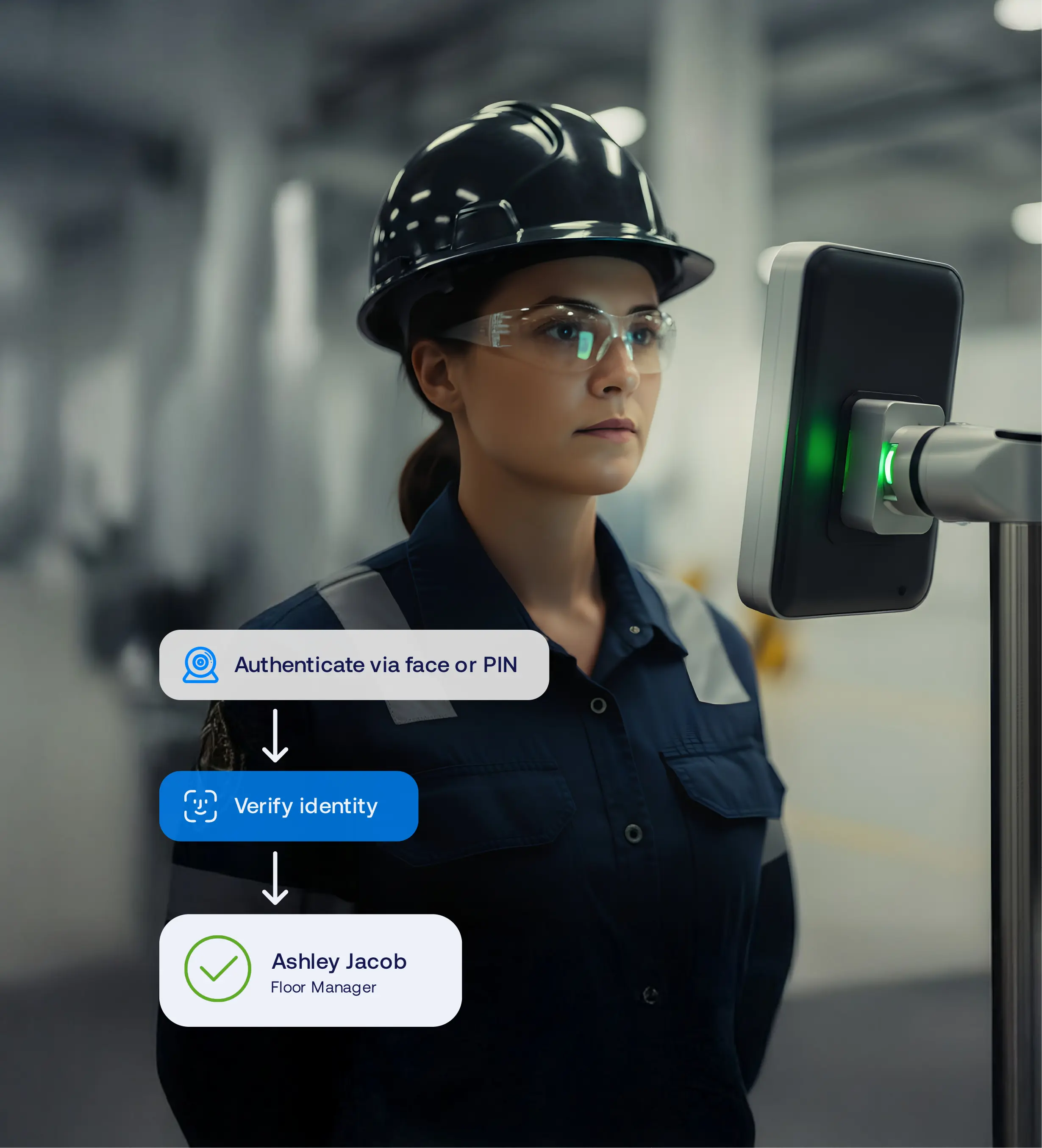 The worker gains access to physical locations, shared workstations, and operational systems via a single secure identity.
